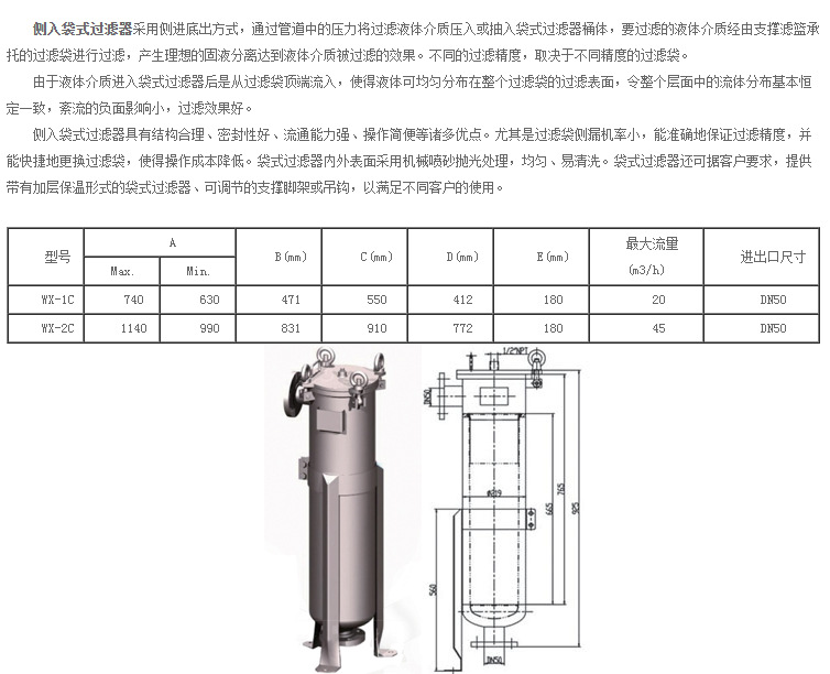 單袋式過濾器,每臺直徑;219,壁厚:3.0,mm,材質(zhì):不銹鋼304材質(zhì),表面進行拋光處理,每臺內(nèi)裝1個PP材質(zhì)的濾袋,有1個不銹鋼濾藍支撐著,過濾精度:1-200μm,參考流量:1-36T/H,袋式過濾器操作簡單,易于維護,過濾精度隨選用的濾袋等級而定,過濾器過濾原理液體由過濾器外殼的旁側(cè)入口管流入濾袋,濾袋本身是裝置在加強網(wǎng)內(nèi),液體滲透過濾袋從底部出口管流出,雜質(zhì)顆粒被濾。此系統(tǒng)操作簡單,內(nèi)側(cè)光滑,使清洗工作方便。